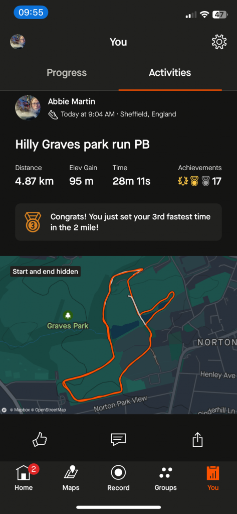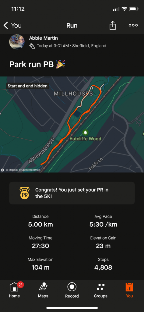 Until last week, my only goal for running was getting to the end of the run. It felt like that was a big enough achievement. However, I have signed up for an extra 2 months health and fitness coaching with Jazzy B fitness and Beth, my coach, wanted me to have a goal to work towards. As I’ve lost most of the weight I was planning to lose, a weight goal of a few pounds didn’t seem enough. So I’m aiming to run Chatsworth 10K on 22 September in an hour or less. To help me work up to this, Beth has set me some running goals for the week and one of them was to do parkrun in 30 mins (which is a personal best for me). Well I totally smashed that goal today as I did it in 27:30 mins!!
